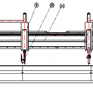 ⑧電器柜 ⑨主移動體 ⑩割炬體() ⑾橫梁 ⑿鋼帶 ⒀副移動體及割炬體(等離子或火焰) ⒁橫向拖鏈 ⒂端梁